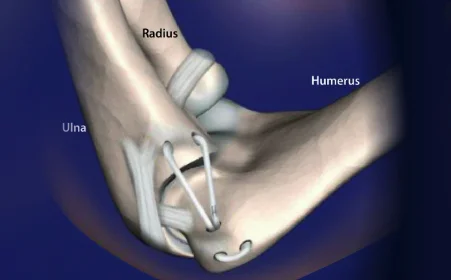 1. Após a cirurgia é utilizado um brace (um tipo de órtese) para sustentar o cotovelo em um ângulo de 60-90º mantendo a articulação imobilizada para a cicatrização do ligamento. Nessa fase, a fisioterapia se concentra nas outras articulações (punho, dedos, ombro) a fim de evitar atrofia muscular.